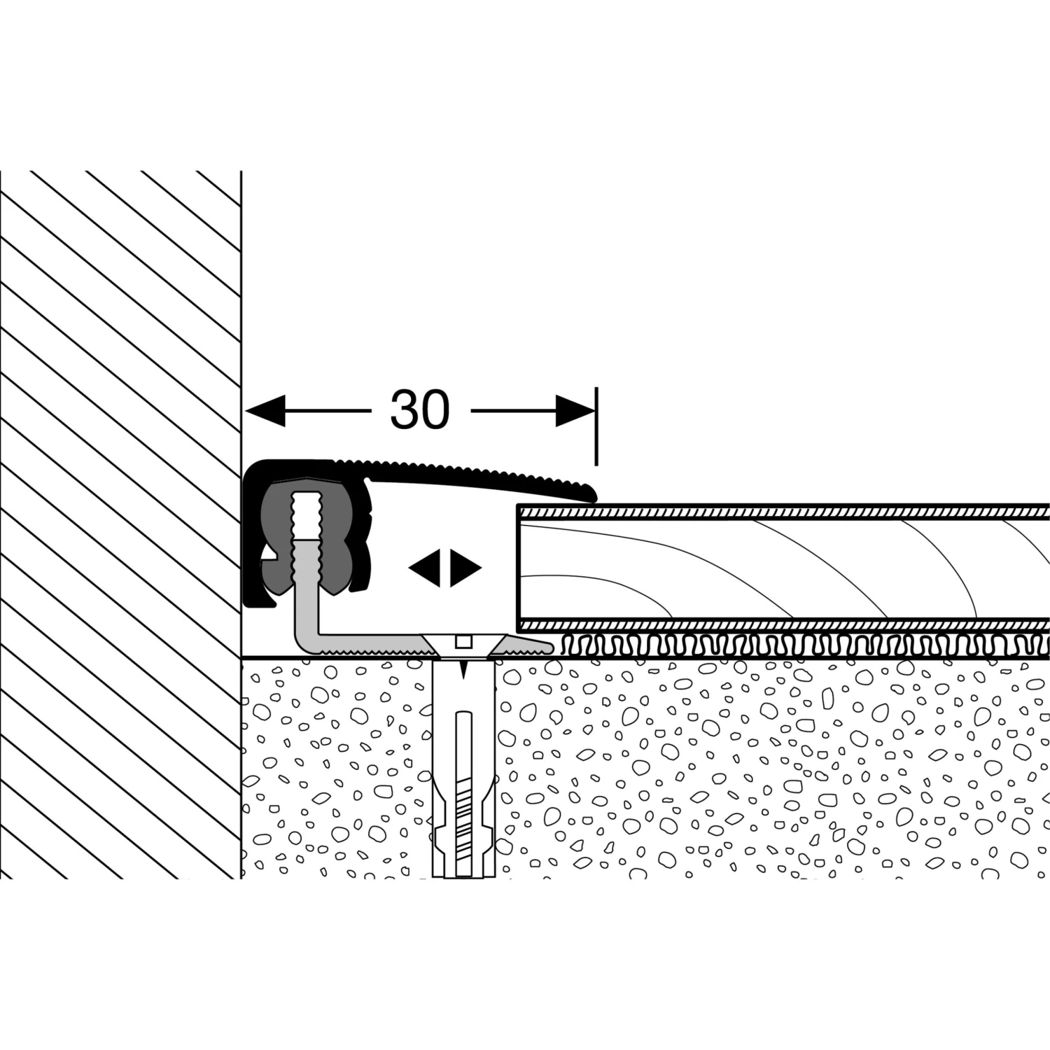 Dans les zones très fréquentées les profils de finition doivent être vissés ET collés à la fois. Voulez-vous augmenter la capacité de charge nous recommandons de remplir la cavité entre le profil de finition et le revêtement de sol.