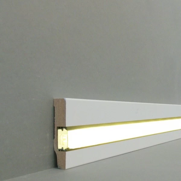 Avec nos plinthes lumineuses vous pouvez jouer avec la luminosité dans vos pièces et créer ainsi un éclairage d’ambiance. Les plinthes murales pour éclairage indirect LED peuvent être équipées de Rubans LED d’intensité de lumière différentes après la pose des plinthes. Selon votre choix vous pouvez ainsi obtenir un éclairage d’ambiance ou un éclairage plus intense. Profitez des avantages de la nouvelle technologie LED pour un éclairage indirect et réalisez vos idées de lumière. Ces plinthes LED s’adaptent à toutes les pièces de votre habitation. Créez un éclairage de style avec les plinthes pour éclairage indirect. L’éclairage d’ambiance n’est plus seulement réservé aux restaurants et aux hôtels.