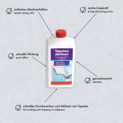 | Caractéristique: | einfaches Mischverhältnis, schnelles Durchweichen und Ablösen von Tapeten, schnelle Wirkung, starke Lösekraft |