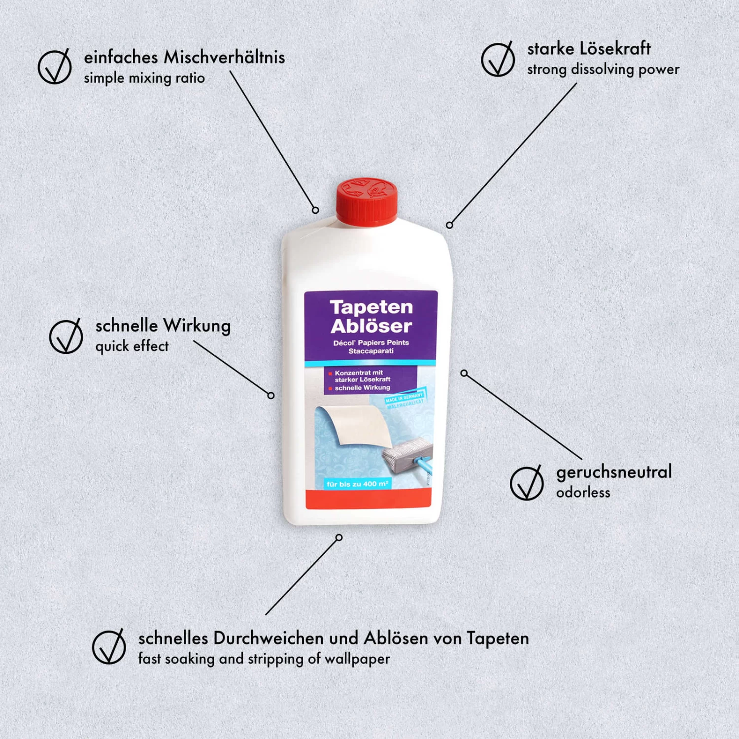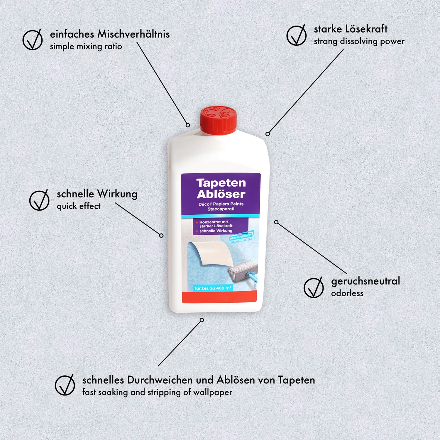 - Très bon et rapide trempage du papier peint grâce à un concentré spécial de tensioactifs